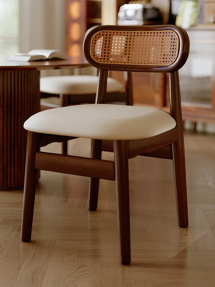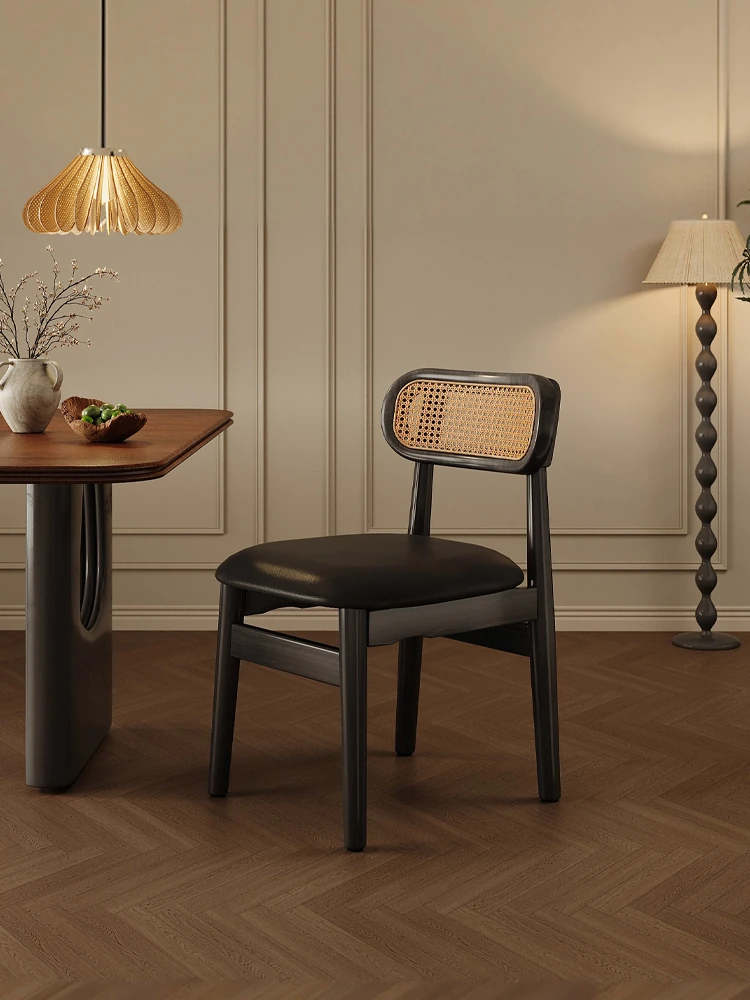 高級感溢れる無垢材のダイニングチェア、優雅なラタン背もたれ付き、フレンチスタイルの小さな椅子。軽やかなデザインで、黒いダイニングテーブルにもぴったり。家庭用にも最適な贅沢なひとときを演出します。