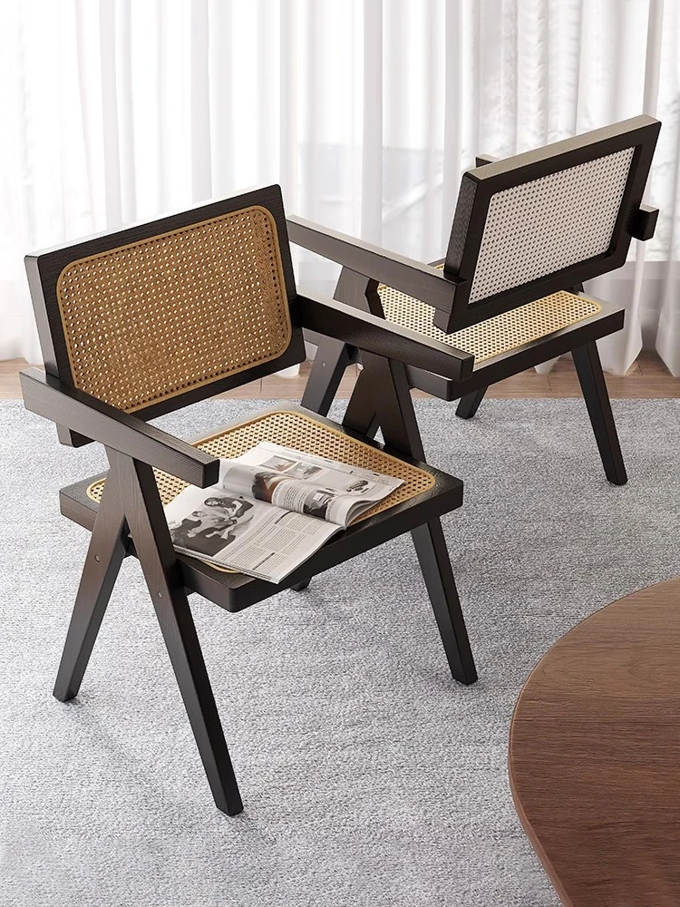 家庭用 藤編み チャンディガールチェア 背もたれ付きの実木製ダイニングチェア アンティークスタイルのリラックスできるティーチェア