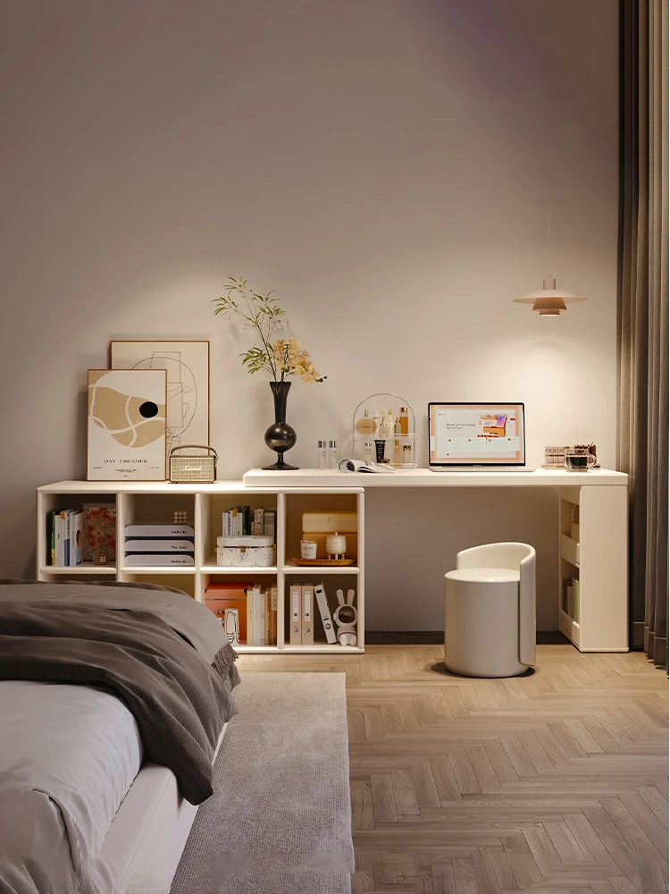 Creamy Style Vanity Desk: Multi-Functional Makeup and Computer Table for Girls, Perfect for Bedroom or as a Stylish Bedside Workstation.