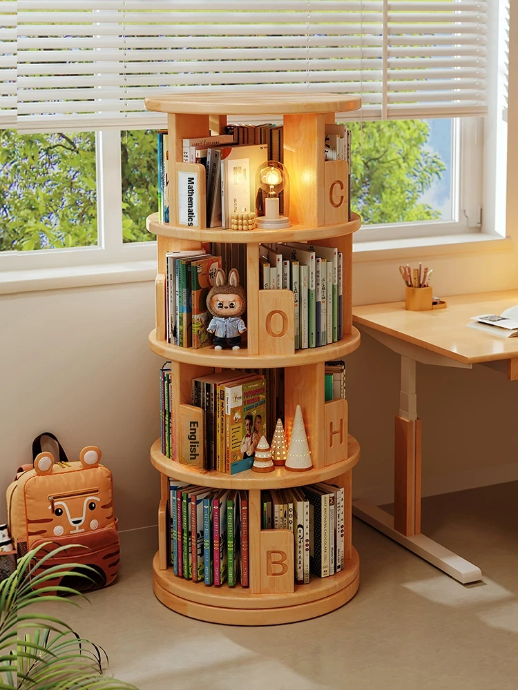 360-Degree Rotating Solid Wood Children's Bookshelf - Space-Saving Floor Standing Bookcase for Student Desks and Bay Windows