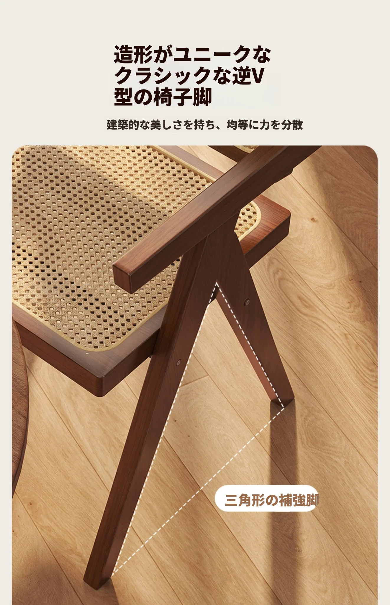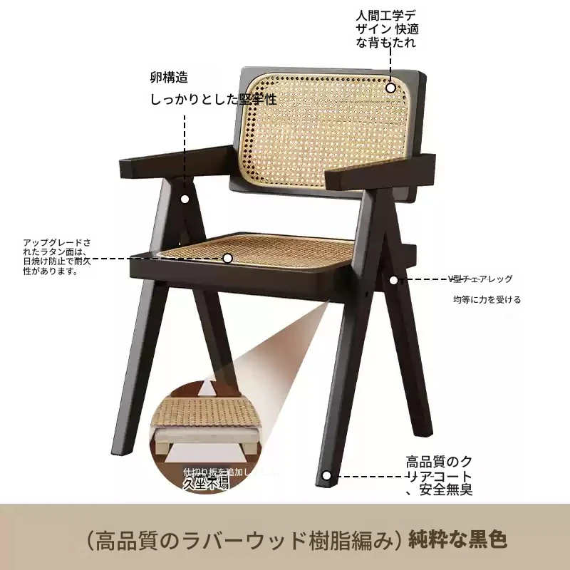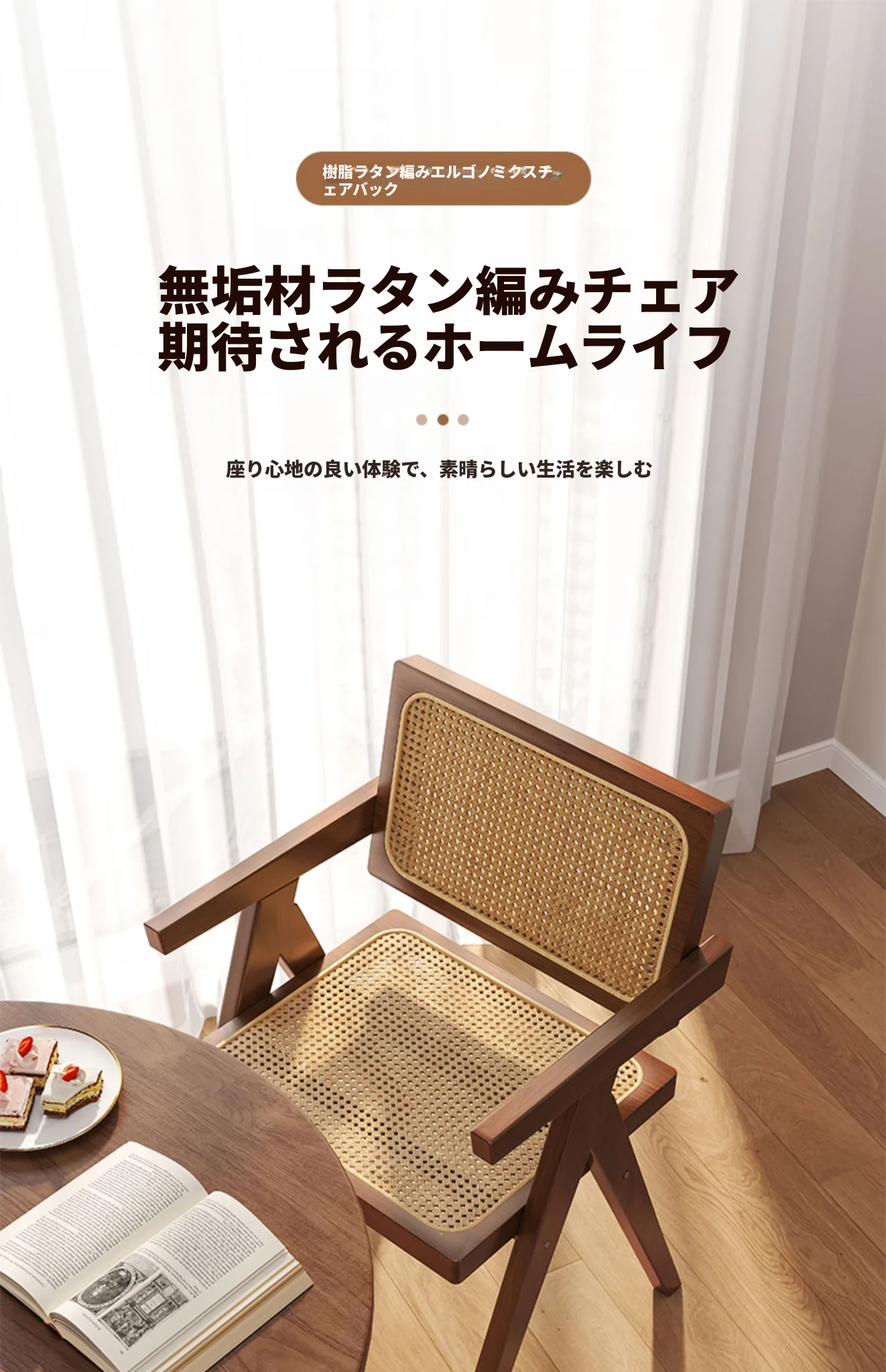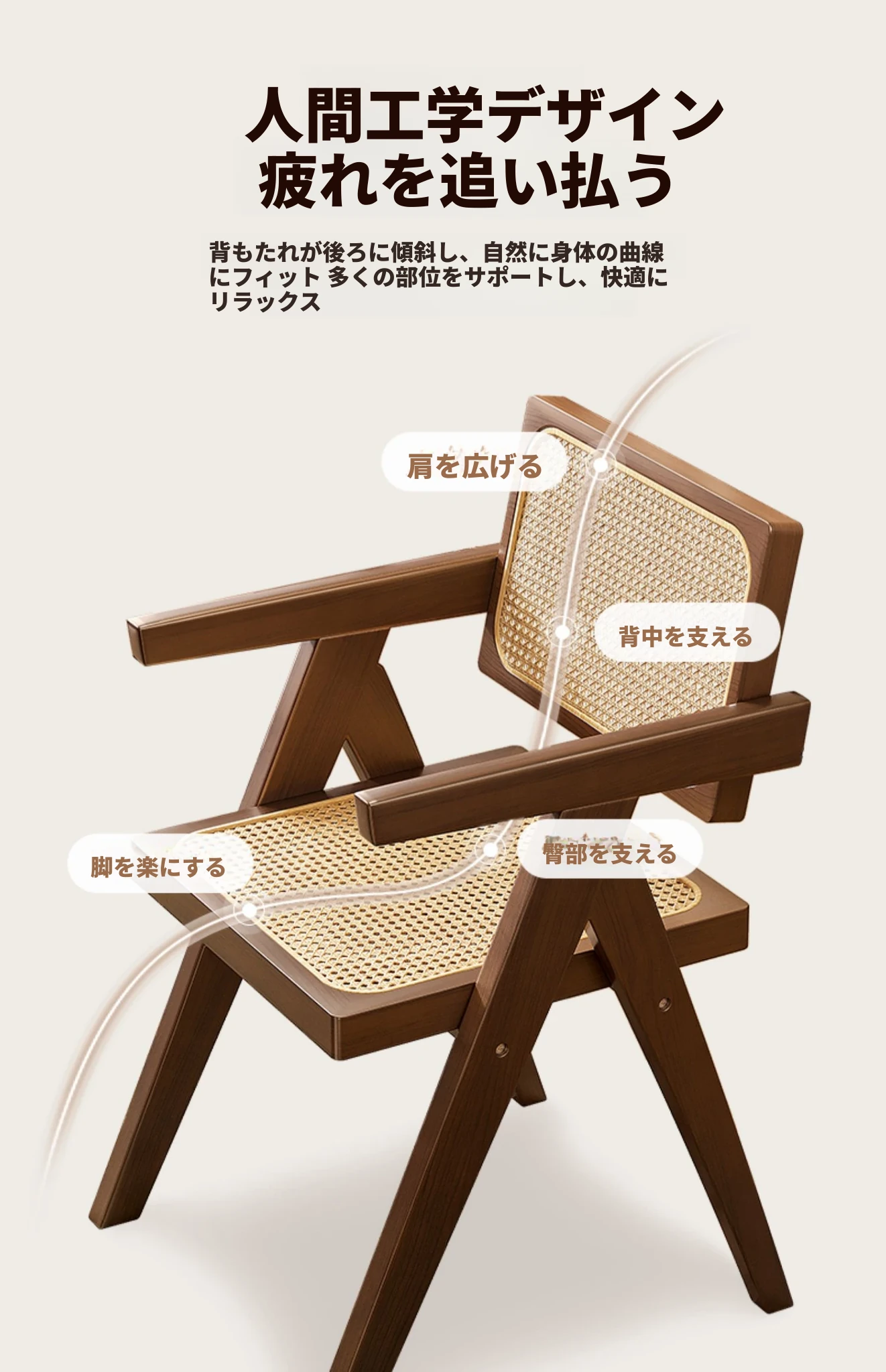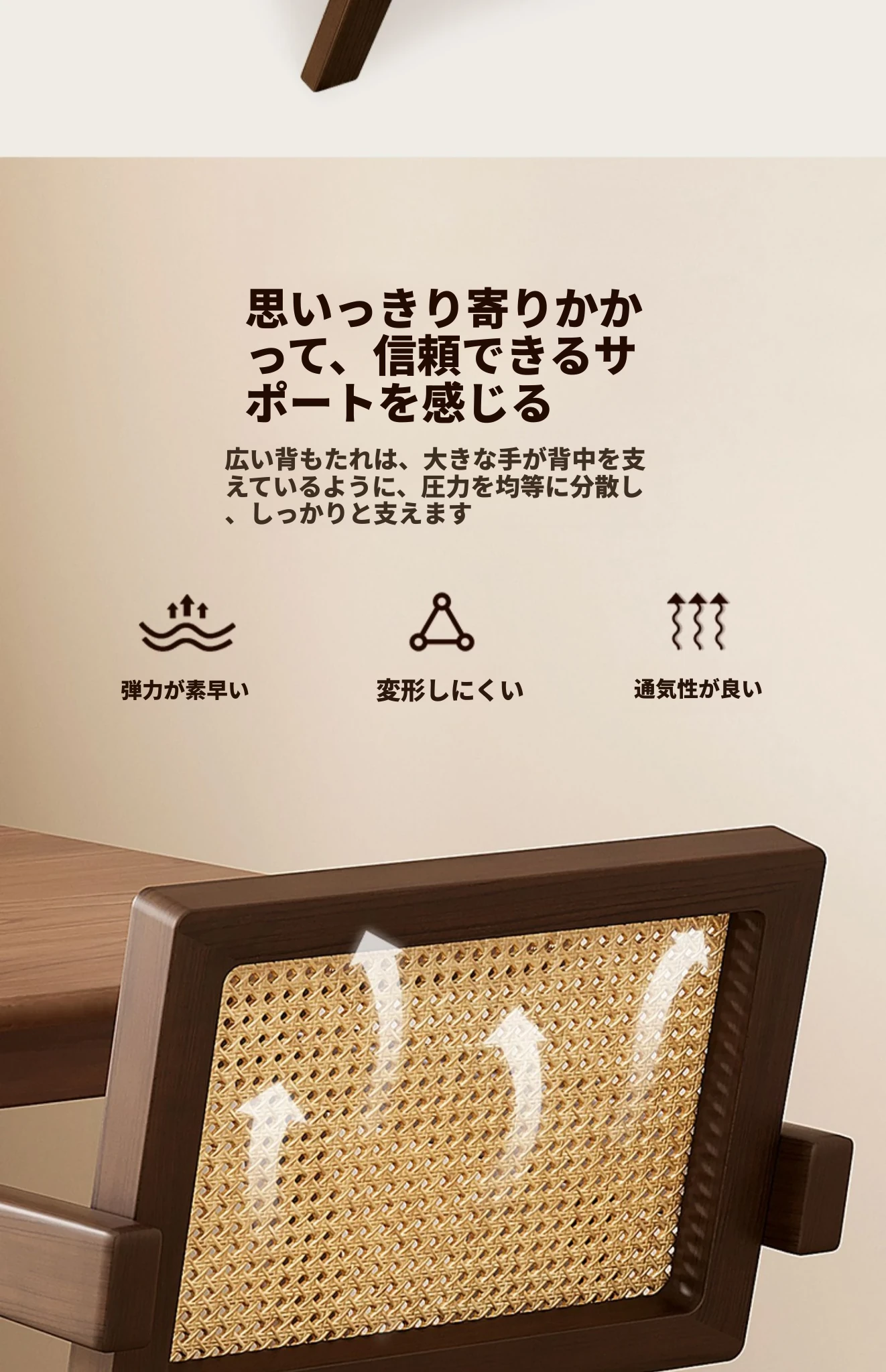 中古の無垢材とラタン編みのダイニングチェア - デザイナー「チャンディーガル」のスタイル!快適な背もたれとアームレスト付きで、家庭用や書斎、リラックス空間に最適です。おしゃれで機能的な一脚をお楽しみください!