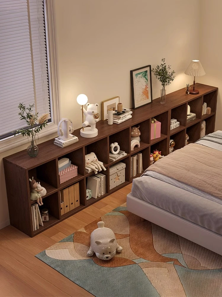 ウォールナット色の無垢材ナイトテーブル兼書棚、自由に組み合わせ可能な格子デザイン!寝室の隙間にぴったりフィットする収納キャビネットで、スタイリッシュに整理整頓!