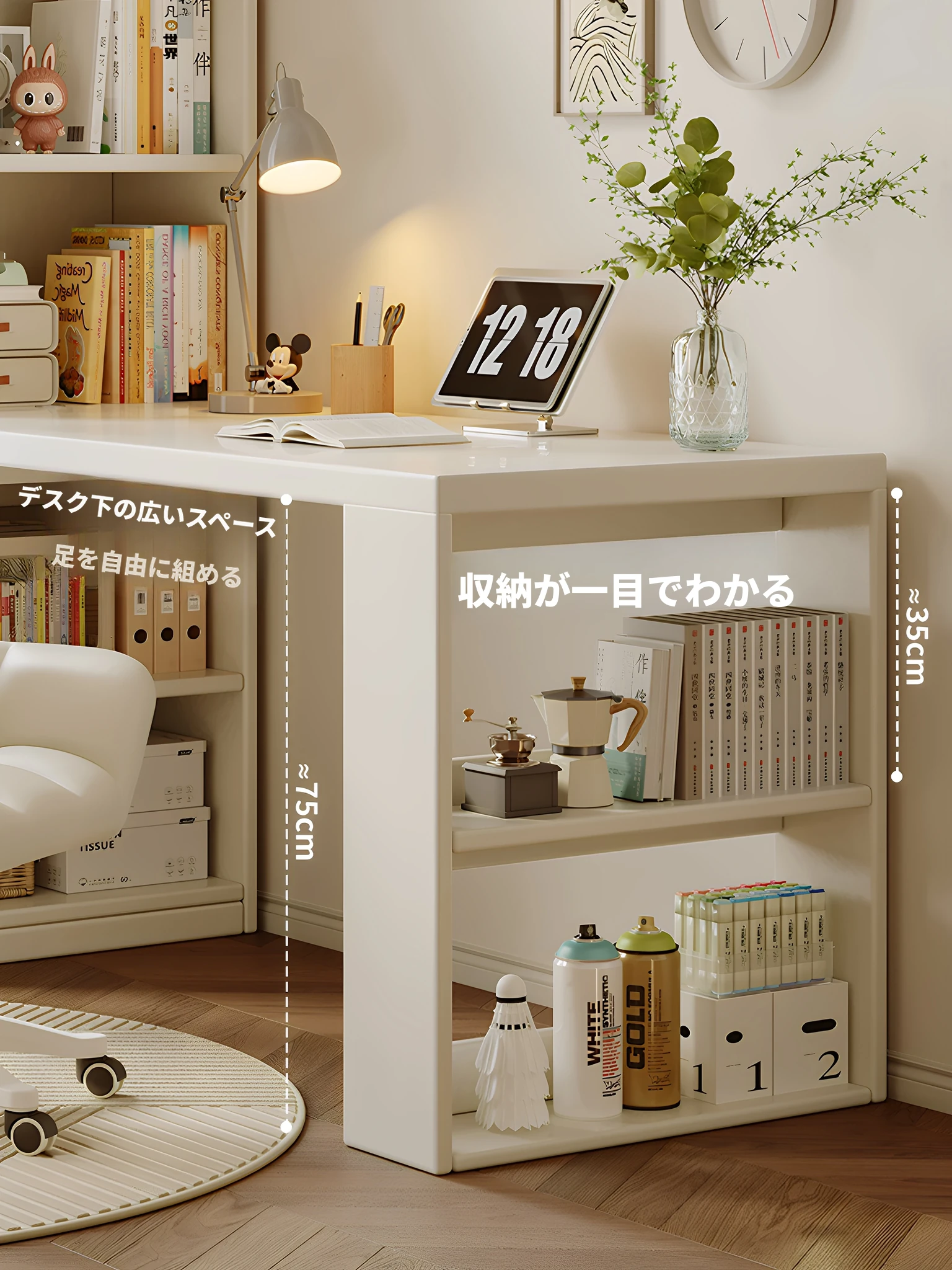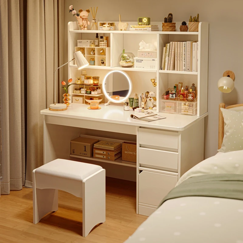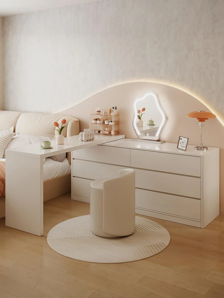 クリーミーな風合いの現代的な簡約化粧台!おしゃれなコーナーデスクとL型の半包囲ベッドサイドキャビネットが一体化。お部屋を華やかに演出し、毎朝のメイクアップタイムを特別なひとときに。