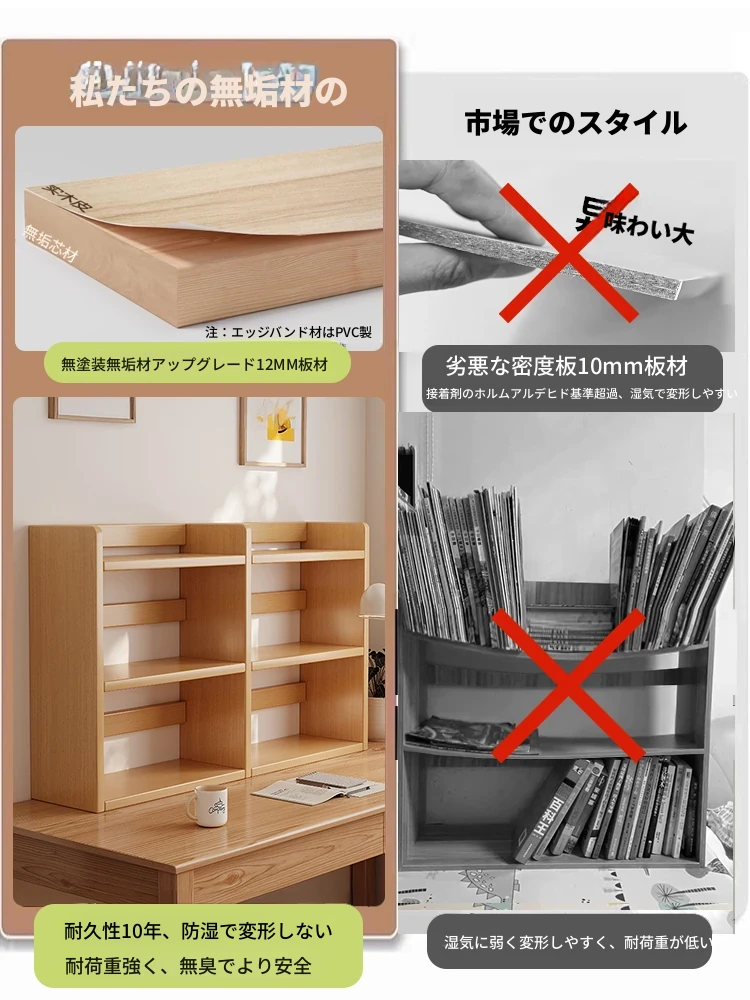 天然木製のデスク用書棚 - 学生や家庭に最適!多段階の収納で本や文具を整理整頓。オフィスや自宅のデスクをスタイリッシュに演出し、作業効率もアップ!