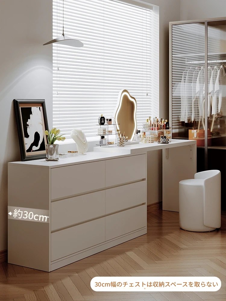 窓辺にぴったり!シンプルでモダンなメイクアップデスク収納キャビネット一体型、寝室に最適なコンパクトサイズの収納テーブル。あなたのビューティーライフをもっと便利に!