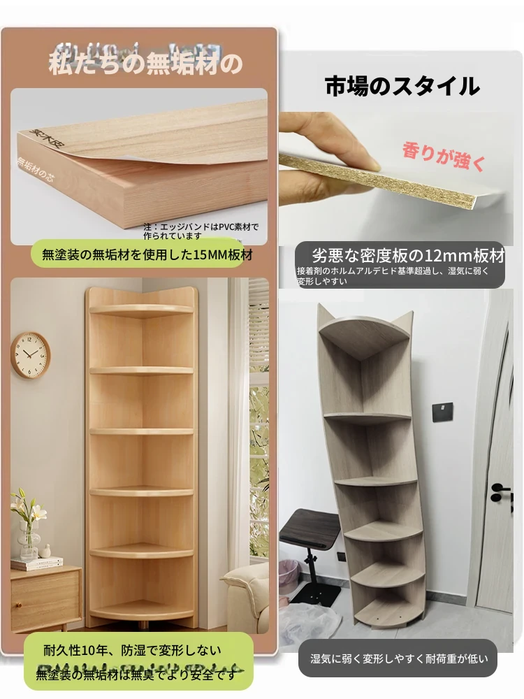 天然木製のベッドサイド収納ラック|角にぴったりフィット!多層フロアコーナーキャビネット|おしゃれな扇形ブックシェルフで、あなたの寝室をスッキリと整理整頓!