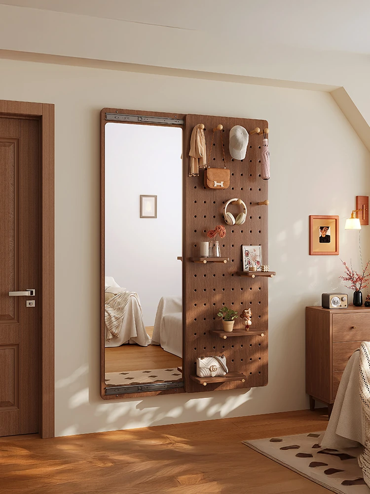 天然木製の穴あきミラー付きドア収納ラック!スタイリッシュな全身鏡と便利な衣類収納で、玄関をおしゃれに演出。家の中の整理整頓も簡単に実現します!