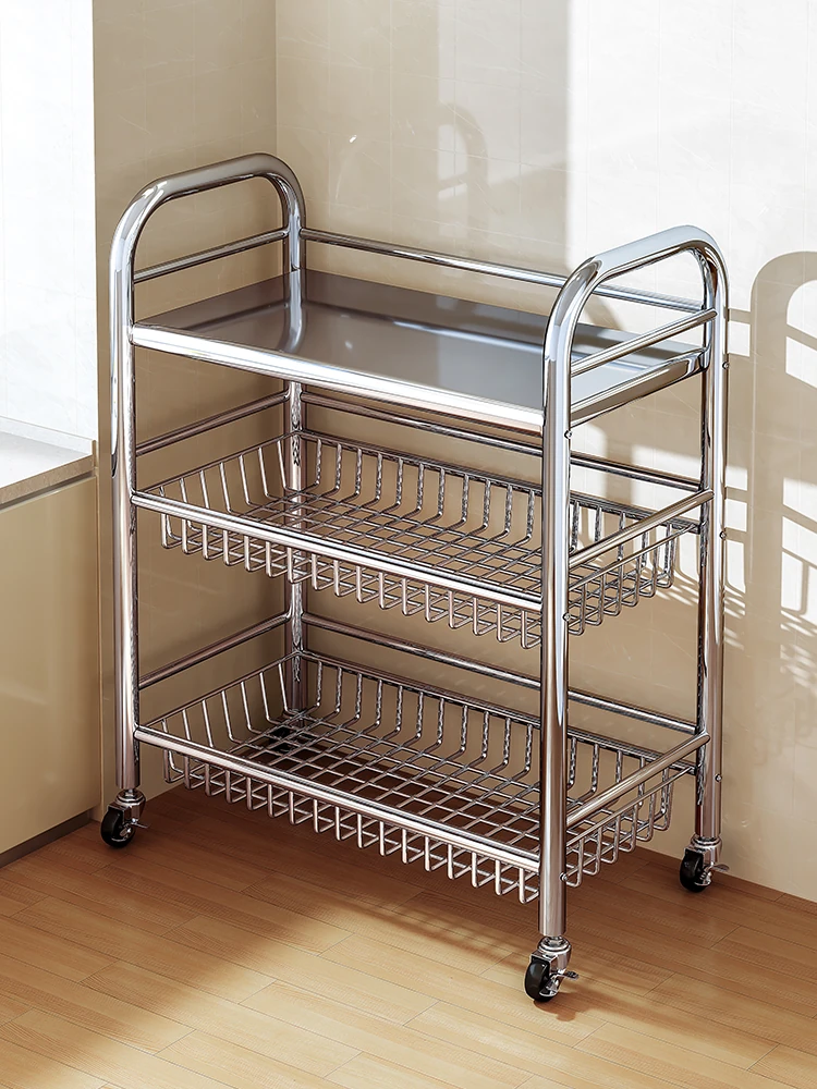 ステンレス製の多層キャスターワゴン - リビングやキッチンに最適な移動式収納ラック、便利な野菜バスケット付き!おしゃれで機能的な収納ソリューション!